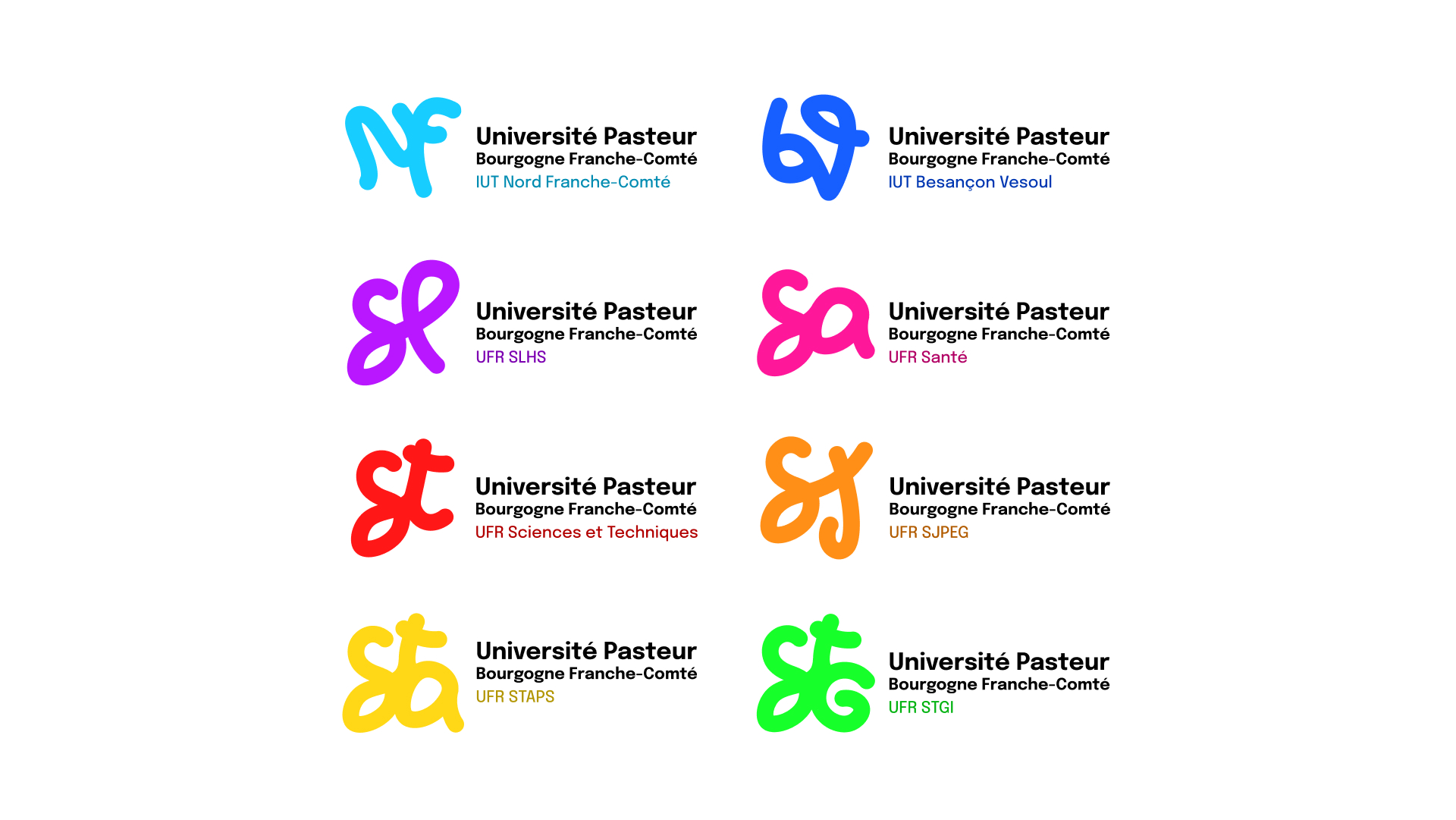 Le logo de l’Université Pasteur Bourgogne Franche-Comté est conçu pour être polymorphe, ce qui signifie qu’il peut adopter différentes formes tout en conservant une identité visuelle cohérente. Chaque composante dispose d’un logo unique qui intègre le style du logo principal, mais avec des variations adaptées à son identité propre.